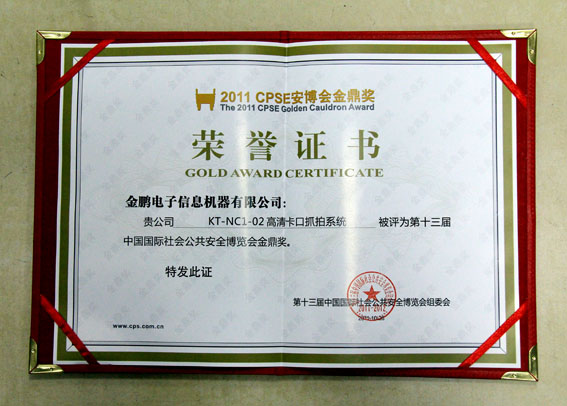 2011年10月28日晚,来自安防行业的代表齐聚深圳深航国际酒店,参加由CPSE安博会组委会举办的第13届CPSE安博会金鼎奖颁奖典礼,金鹏KT-NC1-02高清卡口抓拍系统获得金鼎奖殊荣。