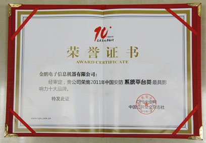 1月7日,由CPS中安网、中国公共安全杂志社、国际安防品牌实验室、中国公共安全研究院主办的“2011年中国安防最具影响力十大品牌”及“2011年度中国安防十大新锐产品奖”颁奖盛典在深圳落下帷幕,来自全国各地的1500多名安防届人士参加了盛大的颁奖典礼。金鹏喜获十大品牌及十大新锐产品2个奖项。